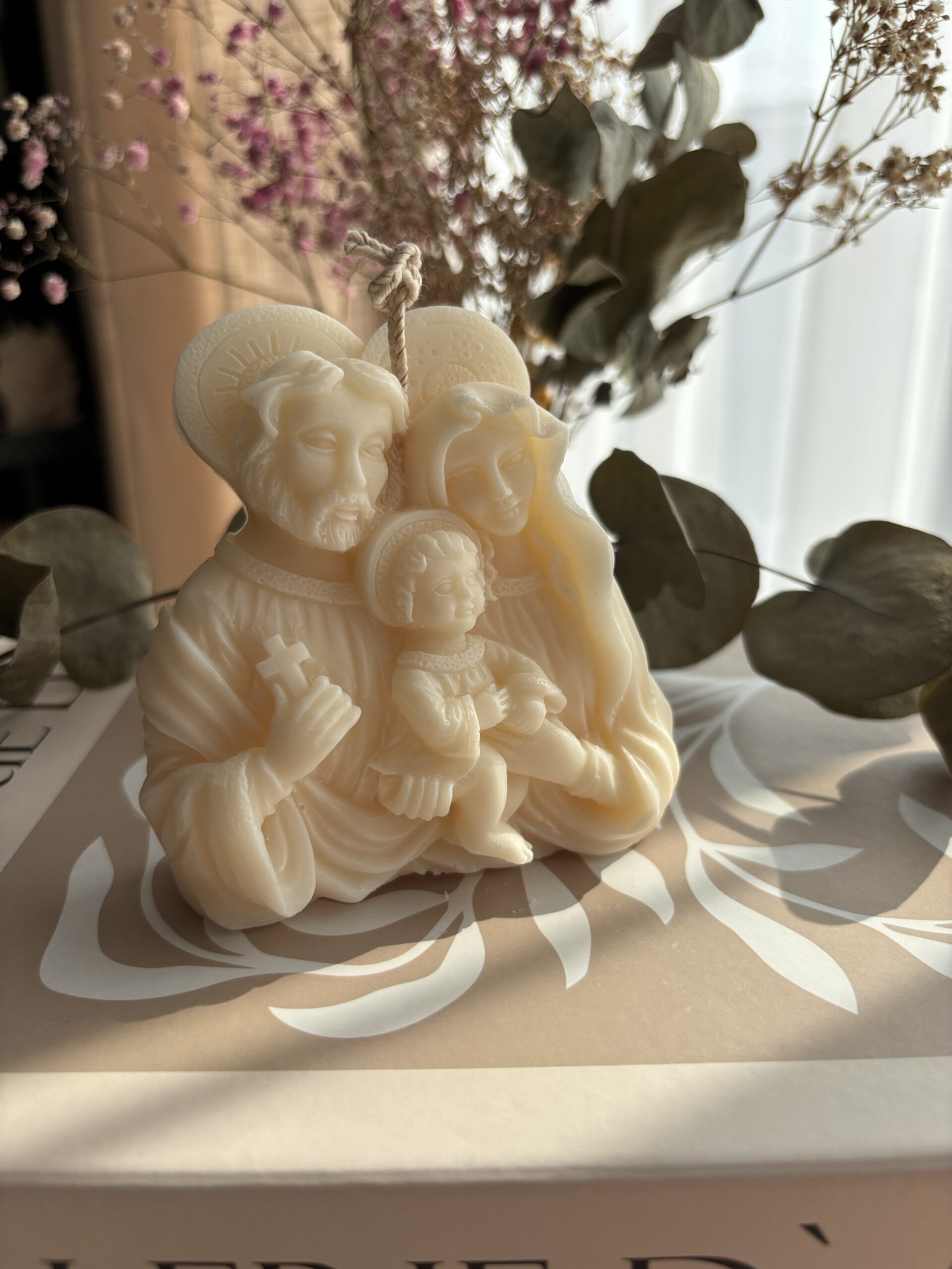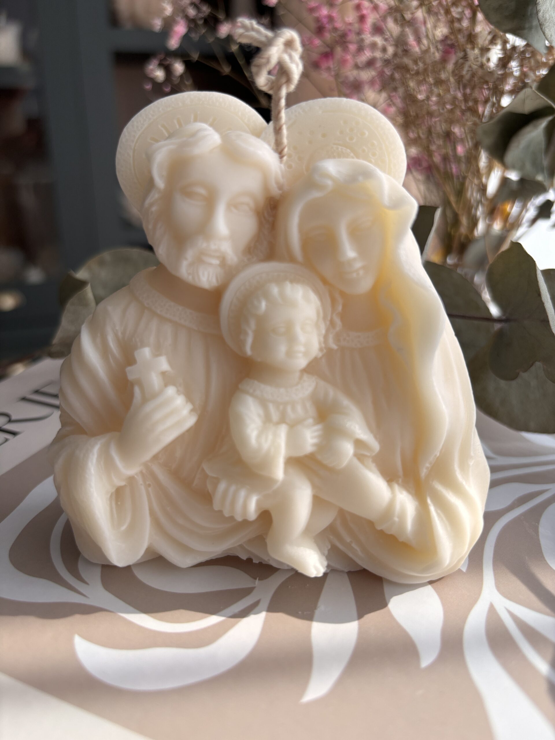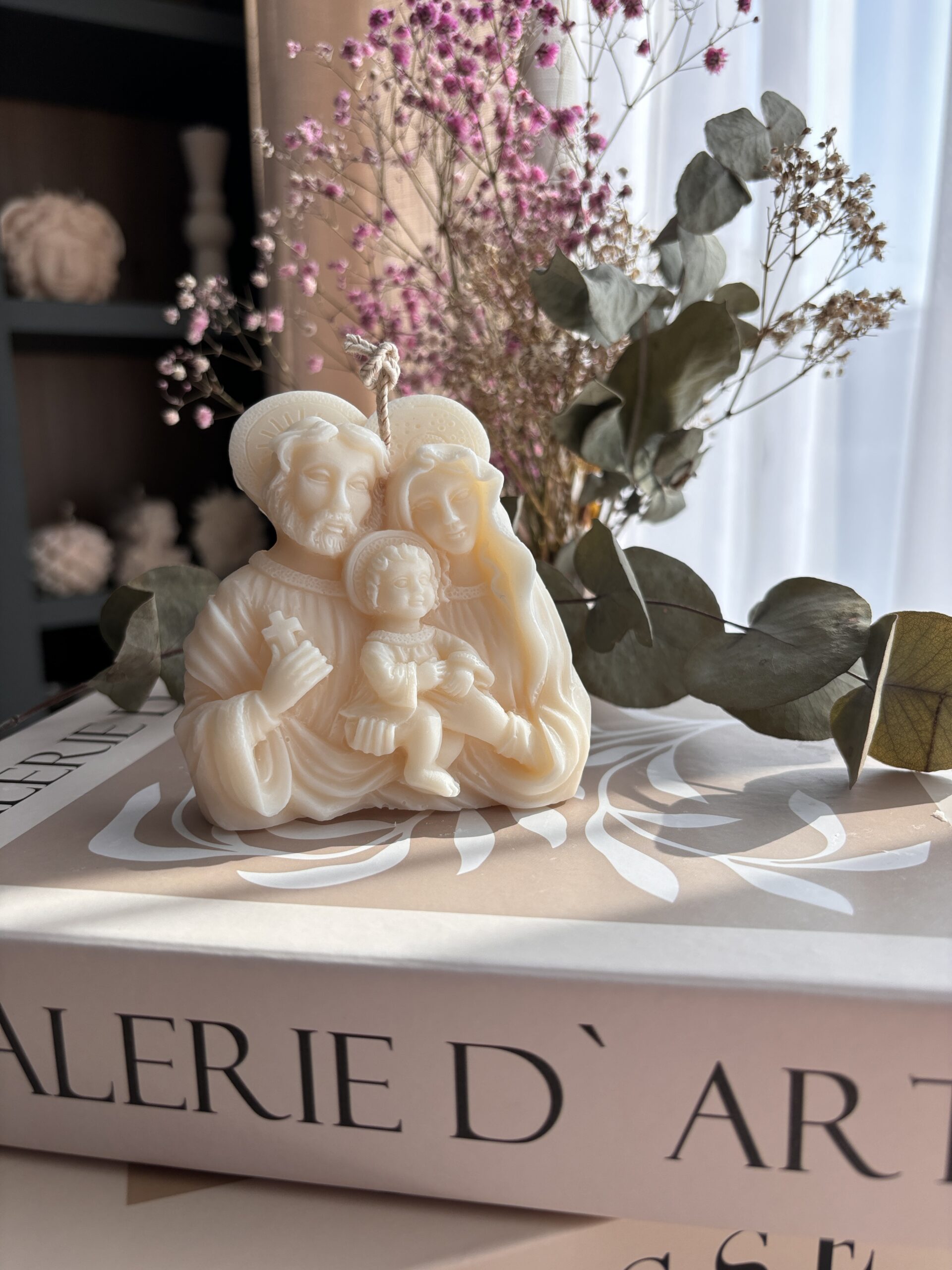 Aceasta lumanare Fecioara Maria familie este realizata manual cu ceara naturala de soia pentru o ardere sanatoasa. Fabricat cu fitil din bumbac.